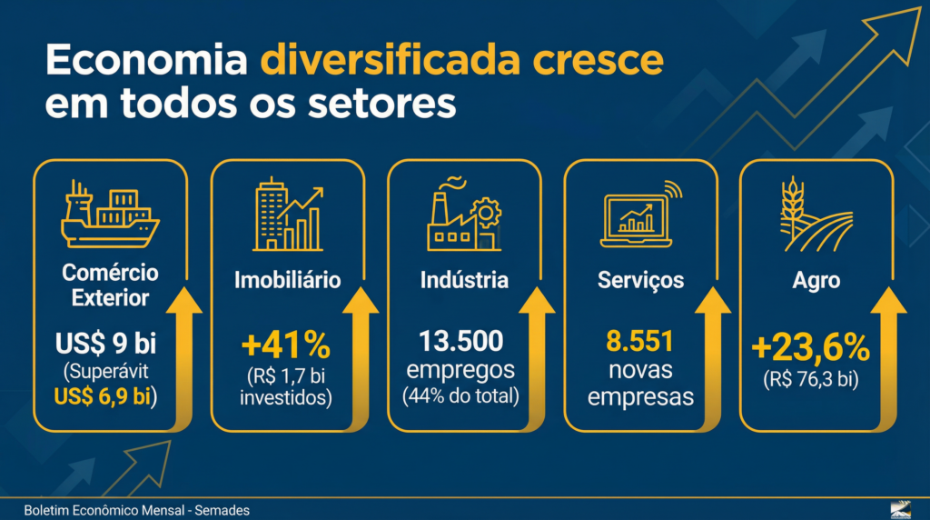 No agronegócio, o Valor Bruto da Produção alcançou R$ 76,3 bilhões, com crescimento de 23,6%. A força do setor se soma à diversificação produtiva, com participação ativa de pequenos produtores, cooperativas e uso crescente de tecnologia, consolidando um modelo moderno e resiliente.