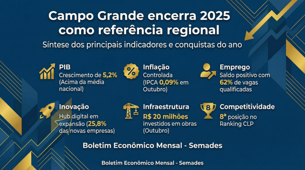 Para 2026, as perspectivas são positivas. O município projeta continuidade do crescimento econômico, manutenção da inflação em níveis controlados e novos avanços no ambiente de negócios, com foco em inovação, atualização de marcos legais, criação de um comitê permanente de desburocratização e implantação de soluções de Inteligência Artificial na Secretaria Municipal de Meio Ambiente, Gestão Urbana e Desenvolvimento Econômico, Turístico e Sustentável, em parceria com a Fundação de Apoio ao Desenvolvimento do Ensino, Ciência e Tecnologia do Estado de Mato Grosso do Sul.